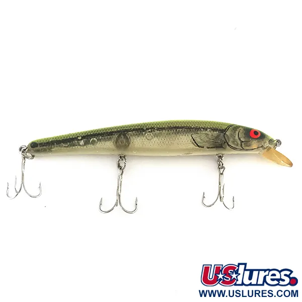 Siekdamas solidų 15 cm (6") ilgį, šis grakštus „minnow“ profilis yra klasikinis Bomber Magnum Long A pavyzdys, atpažįstamas pagal produkto kodą 8407. Bendras 26 g (1 oz) svoris daro jį rimtu įrankiu dryžuotųjų ešerių, sterkų ir stambių ešerinių žuvų žūklei. Spalvinė gama pasižymi žalsvai gelsva (chartreuse) nugara, kuri šonuose pereina į detalų sidabrinį žvynų raštą, baigiasi pusiau skaidriu pilvu ir yra paryškinta ryškia raudona akimi. Šis egzempliorius yra 5/5 būklės, su labai švaria furnitūra ir skaidriu liežuvėliu. Metant masalas pasiekia 0,6–0,9 m (2–3 ft) gylį, o velkiaujant gali panerti nuo 1,2 iki 2,4 m (4–8 ft). Trys tvirti trišakiai kabliukai prie korpuso pritvirtinti žiedeliais, o tai atspindi patvarią JAV gamybos kokybę.