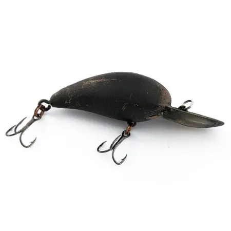 Perdažytas matine juoda spalva, šis 11 g svorio vobleris yra klasikinio Bomber Model 6A modelio, kurio prekės kodas 20757. Kilęs iš JAV kaip „Model A“ serijos dalis, 5 cm ilgio masalas turi ryškų liežuvėlį, leidžiantį pasiekti 1,8–2,4 m gylį. Individualus juodas padengimas apima visą korpusą, o galvą puošia paprastos raudonos akys. Tai plaukiantis, triukšmingas modelis su vidiniu barškučiu, todėl puikiai tinka tiek spiningavimui, tiek velkiavimui gaudant lydekas bei starkius. Fizinė būklė vertinama 3/5 – matomi natūralaus naudojimo pėdsakai po ankstesnių žvejybų, tačiau masalo konstrukcija išlieka tvirta. Prie pilvelio ir uodegos pritvirtinti du trišakiai kabliukai, priekinis iš jų įtaisytas iškart už plataus liežuvėlio.