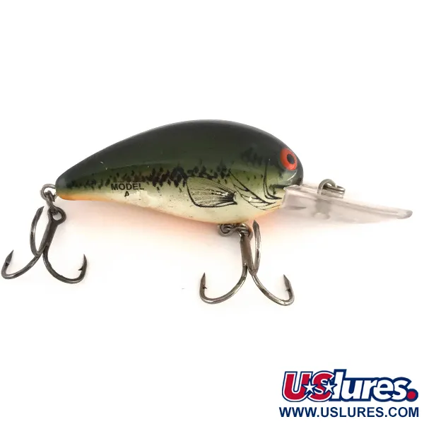 Klasikiniu Baby Bass raštu papuoštas Bomber Model 6A su detaliais žvynais ir tamsia šonine linija puikiai atspindi savo grobio išvaizdą. Šis 11 g (2/5 oz) svorio ir 5 cm (2") ilgio vobleris yra puikus Model A serijos pavyzdys, pažymėtas produkto kodu 7853. Pailgas skaidrus liežuvėlis skirtas pasiekti 1,8–2,4 m (6-8 ft) gylį, todėl tai patikimas pasirinkimas gaudant sterkaus ar lydekas tiek spiningaujant, tiek velkiaujant. Vidinis barškutis sukuria subtilų akustinį virpesį po vandeniu. Šone esantis 'MODEL A' įspaudas išlieka ryškus kreminės spalvos pilvelio fone. Furnitūra tvirta, su dviem originaliais trišakiais kabliukais. Šis JAV pagamintas plaukiantis vobleris įvertintas 4/5 balais, turi lengvų paviršinių naudojimo žymių, bylojančių apie jo istoriją vandenyje.