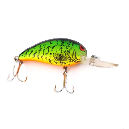Sveriantis 1/3 oz (9 g), šis JAV pagamintas Bomber Model A variantas pasižymi specialia apdaila, skirta matomumui prasto apšvietimo sąlygomis. Korpusas padengtas ryškiu fluorescenciniu žaliu ir geltonu raštu su tamsiomis, dėmėtomis į žvynus panašiomis dėmelėmis, specialiai sukurtomis UV švytėjimo efektui. Kaip parodyta antrajame paveikslėlyje, UV spinduliams jautrūs dažai reaguoja į tam tikrą šviesos spektrą – tai techninė Bomber savybė, padedanti žvejams, gaudantiems sterkus ar lydekas giliuose ar drumstuose vandenyse. Šis vobleris, pažymėtas Model 6A pavadinimu, yra skirtas pasiekti 1,8–2,4 m (6–8 pėdų) gylį tiek spiningaujant, tiek velkiaujant. Jo kompaktiškas 5,5 cm (2 1/4") korpusas turi ilgą, skaidraus plastiko liežuvėlį ir du aštrių, sidabrinės apdailos trišakių kabliukų rinkinius. Įvertintas 5/5, šis egzempliorius yra puikios būklės, išlaikęs ryškias spalvas ir originalią furnitūrą. Klasikinė raudona akis yra ryškus akcentas galvos dalyje, išlaikantis tradicinę Bomber serijos išvaizdą, kartu naudojant šiuolaikinę švytėjimo tamsoje technologiją (produkto kodas 10480).