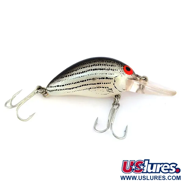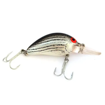 Horizontalūs juodi dryžiai driekiasi per sidabrinį šio Bomber Model B 4A korpusą, sukurdami didelio kontrasto raštą su giliai juoda nugara. 4,5 cm (1 3/4") ilgio masalas, žymimas prekės kodu 10605, yra 5/5 būklės, išlaikęs ryškiai raudoną savo padidintų akių spalvą. Skaidrus liežuvėlis skirtas 0,9 m (3 ft) – 2,1 m (7 ft) gyliui, pritaikytas spiningavimui ar velkiavimui gaudant lydekas ir standartus. Šis JAV pagamintas plaukiantis vobleris (crankbait) sveria 7 g (1/4 oz), turi originalius sidabrinio atspalvio trišakius kabliukus ir nerūdijančio plieno žiedelį valui tvirtinti.