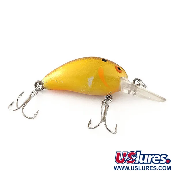 7 g svorio kompaktiškas Bomber model B 4A yra klasikinis JAV gamybos vobleris, išliekantis pagrindiniu masalu gaudant starkius ir lydekas. Dirbdamas 0,9–2,1 m gylyje, plaukiantis modelis puikiai tinka tiek spiningavimui, tiek velkiavimui virš vidutinio gylio struktūrų. Masalas yra ryškiai geltonos spalvos su oranžiniu akcentu šone ir tamsiu žvynų raštu viršutinėje 4,5 cm kūno dalyje. Skaidrus plastikinis liežuvėlis laiko furnitūrą, kurią sudaro du originalūs trišakiai kabliukai. Šis egzempliorius, pažymėtas kodu 12074, yra 4/5 būklės, turi minimalių paviršiaus žymių, atspindinčių jo istoriją, tačiau išlaiko sodrią spalvą. Kontrastingos akys su oranžiniu apvadu ir juodų taškų raštai ant viršugalvio suteikia šiai Bomber serijai būdingą išvaizdą.