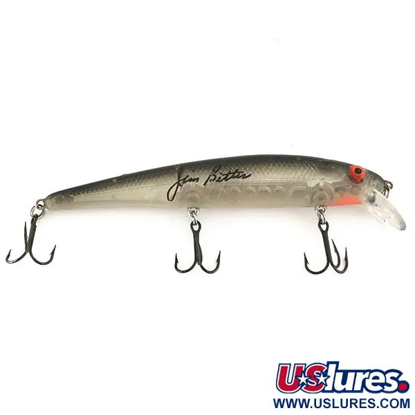 Šis 14 g (1/2 oz) „minnow“ tipo vobleris pasižymi permatoma XCHO apdaila, išryškinančia sudėtingą vidinį žvynų raštą ir klasikinį BASS profesionalo Jim Bitter parašą. 12 cm (4 3/4") ilgio, JAV pagamintas „Bomber Pro 15A“ (produkto kodas 7474) pasižymi neutraliu plūdrumu (suspending), todėl per pauzes jis išlieka stabilus vandens storymėje. Skaidrų kūną pabrėžia tamsiai pilka nugara, ryškiai raudonos akys ir subtili oranžinė dėmė po gerkle, suteikianti tikrovišką profilį tiek spiningaujant, tiek velkiaujant. 7474 modelio viduje esanti barškėjimo kamera sukuria akustinį profilį, papildantį jo vizualinį patrauklumą. Šis konkretus egzempliorius yra idealios 5/5 būklės, su originalia furnitūra – trimis aštriais, juodos apdailos trišakiais kabliukais ir švariu liežuvėliu. Masalas sukurtas nerti į 1,2–1,8 m (4–6 pėdų) gylį ir išlieka kolekcionierių mėgstamas dėl Jim Bitter serijos istorinio ryšio su profesionalių turnyrų sėkme. Parašas šone yra labai aiškus ir puikiai išsilaikęs.
