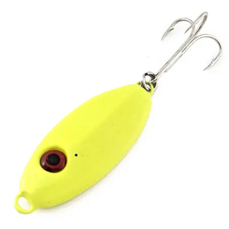 Ši 5 cm ilgio metalinė vertikalaus džigavimo blizgė, padengta gerai matoma ryškiai geltona UV danga, pasižymi išraiškingu profiliu, skirtu žūklei vertikaliai dideliame gylyje. Bomber Slab UV, kurios prekės kodas 20858, sveria 40 g (1 1/3 oz), todėl ji greitai pasiekia kibimo zoną. Švino lydinio konstrukcija pasižymi lašo forma su ryškia raudonai juoda akimi priekinėje dalyje. Sidabrinis trišakis kablys pritvirtintas tvirtinimo žiedeliu galinėje dalyje, o priekyje yra kilpelė saugiam valo rišimui. Gamintojas Bomber panaudojo specialius UV aktyvius dažus, kad užtikrintų maksimalų masalo matomumą prasto apšvietimo sąlygomis arba gilesniuose vandens sluoksniuose. Šis egzempliorius yra puikios būklės, be jokių matomų naudojimo žymių, vertinamas 5/5.