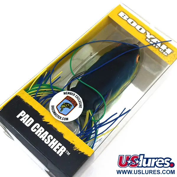 Tamsiai mėlyna nugara pereina į ryškiai geltoną pilvą ant šios 14 g (1/2 oz) tuščiavidurės varlės. Produktas, atpažįstamas pagal kodą 10841, Booyah Pad Crasher yra sukurtas žvejybai tankioje augmenijoje ir tarp lelijų. Daugiaspalvis silikoninis sijonėlis sudarytas iš mėlynų, žalių ir geltonų gijų, kurios imituoja plaukiančios varlės kojas. Šis egzempliorius yra nenaudotas, originalioje geltonoje ir juodoje Booyah Bait Co. pakuotėje su „Member Exclusive B.A.S.S.“ lipduku. Aštrūs, į viršų nukreipti dvigubi kabliukai prigludę prie minkšto kūno, kad būtų išvengta užkliuvimų už žolių, tačiau jie lengvai atsiveria kibimo metu. 6 cm (2 1/4") profilis yra kompaktiškas ir atitinka natūralų masalą. Mažos oranžinės akys sukuria subtilų kontrastą tamsiai galvos daliai. Vidinis svoris subalansuotas taip, kad masalas ant vandens visada nusileistų teisingai, o kabliukų geluonys būtų nukreipti į viršų.