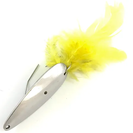 Ryškiai geltonos plunksnos puošia šios 10 g (1/3 oz) nikeliuotos vartiklės galinę dalį, sukurdamos ryškų kontrastą su poliruotu metalu. Įgaubtoje pusėje aiškiai išspausti Tony Accetta ir Weed-Dodger ženklai, identifikuojantys šį 5,5 cm (2 1/4") egzempliorių iš JAV. Tvirta vielinė apsauga nuo žolių išlinksta virš vienašakio kablio – tai firminis Weed-Dodger dizaino bruožas, skirtas metimams į tankią augmeniją. Nikelio danga išlieka ypač atspindinti, o raudoni akcentai ties plunksnų tvirtinimo vieta suteikia visumai klasikinį spalvinį akcentą. Registruotas produkto kodu 5284, šis masalas atspindi vidurio amžiaus Amerikos požiūrį į funkcionalią ir patvarią žūklės įrangą. Plunksnos yra tankios ir ryškios, o metaliniai paviršiai puikiai išlaikyti, todėl būklė vertinama 5/5. Valo tvirtinimo kilpelė siaurajame gale yra švari ir taisyklingos apskritimo formos.
