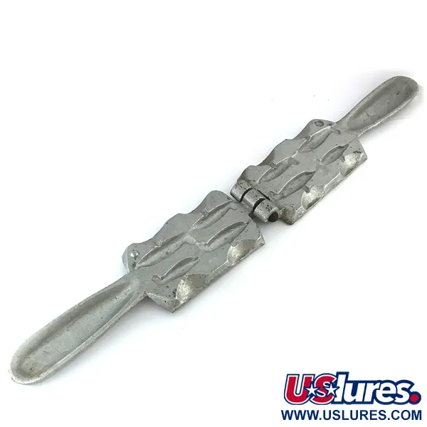 Lietame metaliniame korpuse aiškiai įspaustas pavadinimas C. PALMER kartu su EST. NEWTON PA žyma, nurodančia šios vintažinės svarelių liejimo formos kilmę iš JAV. 20 cm (7 3/4") ilgio ir solidaus 290 g (10,2 oz) svorio įrankis buvo sukurtas žvejams, kad vienu liejimu būtų galima pagaminti kelis svarelius. Atidarius lankstomas puses, atsiveria kelios tiksliai išfrezuotos ertmės, skirtos švino liejimui, o integruotos rankenos užtikrina tvirtą suėmimą. 5/5 būklės sidabriškai pilki paviršiai yra itin švarūs, o šio pavyzdžio su prekės kodu 8369 lygiavimas išlieka tikslus.