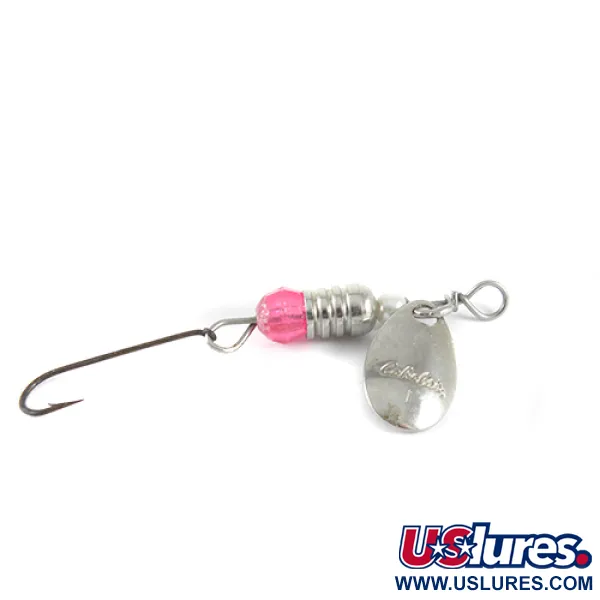 Ant lašelio formos nikelinio lapelio aiškiai įspaustas „Cabela's“ prekės ženklas ir „1“ dydžio žyma nurodo šio masalo kilmę iš vieno svarbiausių vardų Amerikos žvejybos istorijoje. Sverianti 2,5 g (3/32 oz) ir 6 cm (2 1/4") ilgio sukrė pasižymi klasikine konstrukcija, kurią sudaro ryškiai rožinis briaunotas karoliukas ir rumbuotas nikelinis svoris. Mažas baltas tarpinis karoliukas šalia lankelio suteikia subtilų vizualinį kontrastą poliruoto metalo komponentams. Prie vielinio rėmo pritvirtintas vienašakis kabliukas ilgu kotu – tokia konfigūracija dažnai naudojama lengvesniam kabliuko išėmimui arba žvejojant reguliuojamuose vandenyse. Šis JAV pagamintas egzempliorius, žymimas prekės kodu 1540, pasižymi autentiška metalinių paviršių išvaizda, išlaiko 4/5 būklės įvertinimą ir konstrukcinį vientisumą.