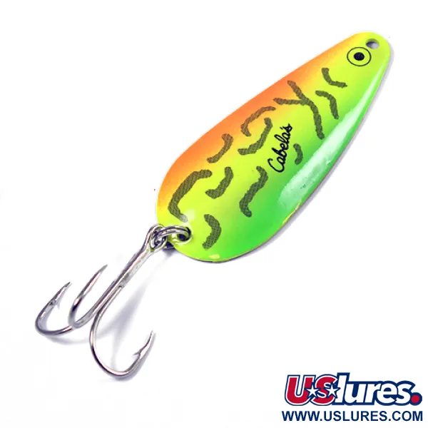 Ryškūs Fire Tiger raštai puošia išgaubtą šios 7 cm (2 3/4") metalinės blisgės pusę, pereinant nuo ryškaus oranžinio peties prie ryškiai geltono pilvo ir citrininės žalios uodegos. Šis Cabela's prekės ženklo masalas, turintis produkto kodą 2190, yra klasikinės JAV gamybos įrodymas. Priekinis paviršius papuoštas juodais vingiuotais dryžiais ir ryškiu juodos akies lipduku, o kitoje pusėje matoma itin poliruota nikelio apdaila, užtikrinanti maksimalų blyksėjimą. Įranga pasižymi tvirtu žiedeliu apačioje, prie kurio pritvirtintas spindintis trišakis kablys. Kalbant apie būklę, masalas yra nepriekaištingas, atrodo visiškai nenaudotas, todėl vertinamas 5/5. 19 g (2/3 oz) svorio blisgė puikiai tinka tolimiems metimams arba vertikaliam džigavimui.