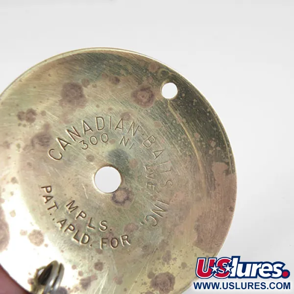 Šilta auksinė apdaila dengia šio vintažinio egzemplioriaus 18 g (2/3 oz) apskritą korpusą. „Canadian Bait“ pagamintas JAV tarp 1960 ir 1970 m., šis 5 cm (2 colių) diskas atspindi minimalistinę masalų dizaino erą. Sunki metalinė plokštelė yra išgręžta per centrą su papildoma tvirtinimo anga šalia krašto, suteikiant universalumo įvairiems montavimo būdams. Masalas turi didelį vienšakį „offset“ tipo kabliuką, pritvirtintą standartiniu žiedeliu, sukurtą patvarumui žvejojant giliuose vandenyse. Produktas su kodu 0797 turi laiko žymių, o jo būklė vertinama 3/5 – matomos paviršiaus dėmės ir nusidėvėjimas palei metalo kraštus. Žalvarinio atspalvio paviršius išlaiko tvirtą blizgesį, todėl tai yra išskirtinis papildymas bet kuriam kolekcininkui, besidominčiam vidurio amžiaus amerikietiška žvejybos įranga.
