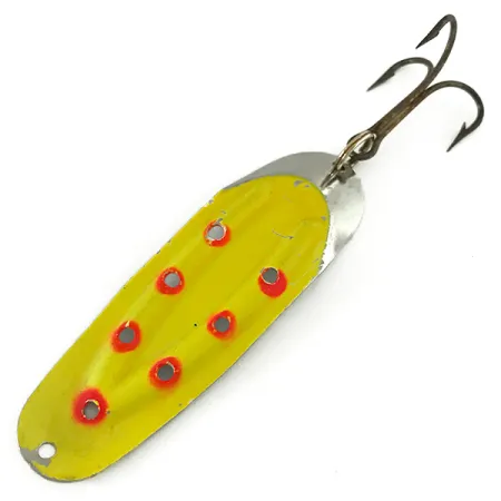 Septyni ryškiai raudoni taškai kruopščiai išdėstyti palei iškilius šios 8 cm blizgės griovelius, sukuriant didelio kontrasto raštą ryškiai geltoname fone. 12,5 g sverianti Charger №3 UV pasižymi fluorescuojančia danga, sukurta švytėti ultravioletinėje šviesoje, o tai padeda išlaikyti matomumą gilesniame ar drumstame vandenyje. Nikelio pagrindas lieka atviras ties valo tvirtinimo kilpa, kur geltoni dažai susiaurėja, suteikdamas metalinį blyksnį. Kitoje pusėje poliruotame metale aiškiai įspaustas J. Rustowicz vardas, žymintis šio dizaino kilmę, kurį dabar gamina Lake Products. Šis konkretus egzempliorius, pažymėtas prekės kodu 7432, turi didelį trišakį kabliuką, tinkamą įvairių plėšrūnų žvejybai spiningu ar vilkimu. Pailgas profilis ir spausti grioveliai yra šios Amerikoje pagamintos klasikos skiriamieji ženklai. Šio masalo būklė yra puiki, vertinama 5/5.