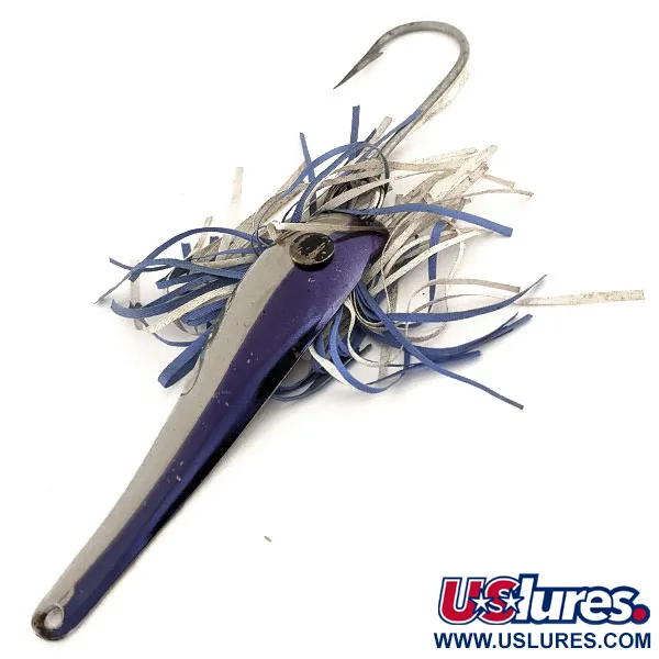 Sverianti 17 g (3/5 oz), ši klasikinė velkiavimo blizgė pasižymi ryškiu kontrastu tarp poliruoto nikelio ir sodrių purpurinių šoninių panelių. „Arnold Tackle Corp“ iš Paw Paw miestelio Mičigane sukūrė Chinco Troller Salmon su lieknu, smailėjančiu profiliu, pritaikytu skrosti vandenį velkiaujant. 9 cm (3 1/2") ilgio sunkus metalinis korpusas turi didelį vienšakį kabliuką, paslėptą gausiame mėlynos, baltos ir rusvos spalvos vinilinių gijų sijonėlyje. Šis JAV pagamintas egzempliorius, pažymėtas kodu 11452, yra puikiai išlikusi Didžiųjų ežerų žvejybos istorijos dalis. Paviršiai ir furnitūra turi tik labai nežymių senėjimo požymių, todėl būklė vertinama 5/5. Viena tvirtinimo kilpa siaurajame gale ir tvirtas „siwash“ tipo kabliukas plačiajame gale pabrėžia praktišką ir funkcinę blizgės konstrukciją.