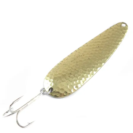 Išskirtinė kalta tekstūra puošia šios Chippewa blizgės paviršių – tai klasikinė žvejų, ieškančių specifinio šviesos sklaidos efekto vandenyje, pasirinkimas. Ant nugarėlės aiškiai išmuštas užrašas „MADE IN U.S.A.“. Šis 9 cm (3 1/2") pavyzdys atspindi patikimą meistriškumą, kuriuo Worth garsėjo XX a. viduryje ir pabaigoje. 19 g (2/3 oz) svorio masalas pasižymi kalto aukso apdaila, kuri išlieka ryški ant lašo formos korpuso. Konstrukciją sudaro sidabrinio atspalvio žiedelis ir aštrus trišakis kabliukas, todėl tai tvirtas pasirinkimas tiek spiningavimui, tiek velkiavimui. Šis konkretus masalas, pažymėtas produkto kodu 1744, yra puikios 4/5 būklės, su gerai išlaikytais paviršiais ir švariu metalu. Jo dizainas buvo neatsiejama JAV žvejų dėžučių dalis, vertinama kaip prieinama ir efektyvi įranga. Viršutinėje blizgės dalyje yra viena anga valui tvirtinti, o apatinis perėjimas prie kabliuko mazgo yra lygus ir tvirtas.