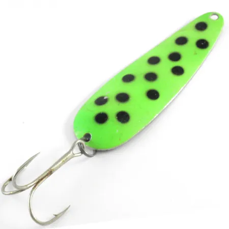 Ryškūs juodi taškai sudaro stiprų kontrastą su ryškiai žaliu dažytu šio 9 cm (3 1/2") metalinio masalo paviršiumi. Worth gamybos JAV, Chippewa modelis buvo pagrindinis amerikiečių žūklės dėžučių elementas XX a. pabaigoje, vertinamas dėl stabilaus darbo kaip nebrangi mėtomoji blizgė. Šis konkretus pavyzdys, kurio produkto kodas 4230, pasižymi poliruoto nikelio nugarėle, kuri suteikia aiškų blyksnį prieš dažytą priekinę dalį. 19 g (2/3 oz) sveriantis masalas turi tvirtą trišakį kabliuką, pritvirtintą žiedeliu uodegoje. Būklė vertinama 4/5, paviršius labai švarus, išlaikęs pradinį žalio pigmento sodrumą. Siaurajame gale išmušta nedidelė skylutė, skirta tiesioginiam valo rišimui arba suktukui su segtuku.