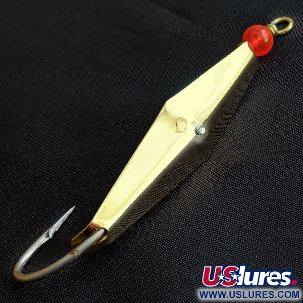 Vidinėje pusėje aiškiai iškaltas užrašas „THE GENUINE CLARK SQUID ST. PETE., FLA.“, patvirtinantis, kad tai autentiškas James E. Clark kūrinys iš Floridos pakrantės. 8 g (1/4 uncijos) sveriantis masalas pasižymi aštriu deimanto formos profiliu ir poliruotu auksiniu paviršiumi, kuris atspindi šviesą iš kelių pusių. Prie galvos, šalia kilpelės valui tvirtinti, įtaisytas vienas raudonas karoliukas, sukuriantis subtilų vizualinį akcentą metaliniame korpuse. Žolėms atspari konstrukcija turi vieną tvirtą kabliuką, pritvirtintą centriniu varžtu – tai gamintojo funkcinio požiūrio į pakrančių žvejybą bruožas. Šis egzempliorius, kurio prekės kodas yra 18817, yra 5/5 būklės, išlaikęs blizgantį atspindintį paviršių ir švarią furnitūrą. Kabliukas įkomponuotas į vartiklės geometriją per nedidelį tvirtinimo blokelį įgaubtoje pusėje.