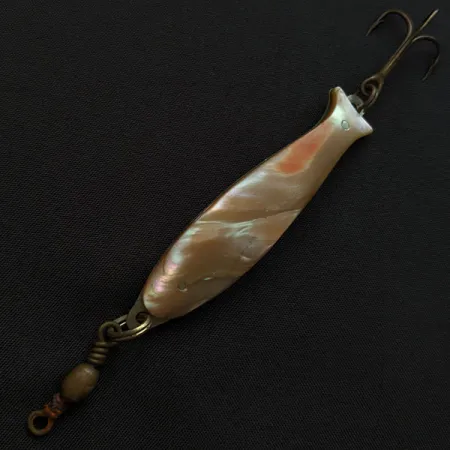 Ši 7 cm ilgio Compac vartiklė atspindi XX a. vidurio Japonijos žvejybos įrankių gamybos meistriškumą, išsiskirdama vientisu, mirgančiu perlamutro sluoksniu. Natūralus kriauklės sluoksnis yra kruopščiai suformuotas pagal žuvies formos masalo profilį ir pritvirtintas prie sidabrinio atspalvio metalinio pagrindo dviem matomomis kniedėmis. 14 g sveriantis 19657 modelis pasižymi solidžia mase, tinkančia tolimiems metimams ar velčiavimui gylyje. Metalinė nugarėlė yra nupoliruota ir lygi, sudaranti kontrastą natūraliam abalono inkrustacijos švytėjimui. Masalas sukomplektuotas su tvirtu cilindriniu suktuku priekyje ir bronzuotu trišakiu kabliuku gale. Šis konkretus egzempliorius yra puikios būklės, vertinamas 5/5 balais. Japoniška kilmė primena laikotarpį, kai Compac garsėjo išskirtinio dizaino vartiklių importu, kuriose estetinė išvaizda derėjo su funkciniu patvarumu.