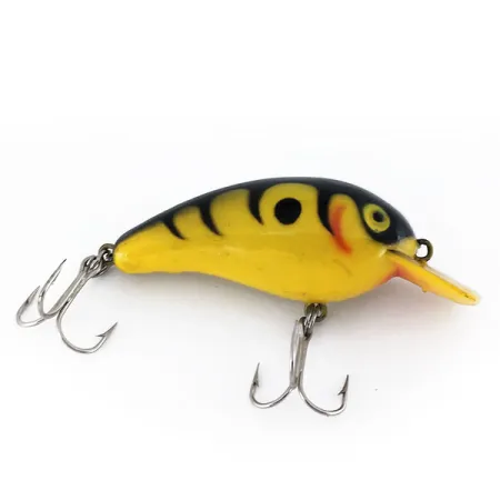 Ryškiai geltoname šio klasikinio voblerio korpuse išsiskiria juodos vertikalios juostos ir apskritos dėmės. Šis Cotton Cordell Big O, prekės kodas 9986, sveria 1/4 oz (7 g) ir yra 2" (5 cm) ilgio. Tai plaukiantis, triukšmingas masalas, sukurtas panerti į 0,6–1,2 m (2-4 pėdų) gylį traukimo metu. Šis JAV pagamintas modelis idealiai tinka lydekų ir ešerių žūklei spiningaujant ar velkiaujant. Būklė vertinama 5/5: švari apdaila ir puikiai išlaikyta furnitūra, įskaitant du sidabrinės spalvos trišakius kabliukus. Raudonų dažų potėpis žiaunų srityje sukuria tradicinį kibimo stimuliatorių masalo priekyje, šalia geltono liežuvėlio.