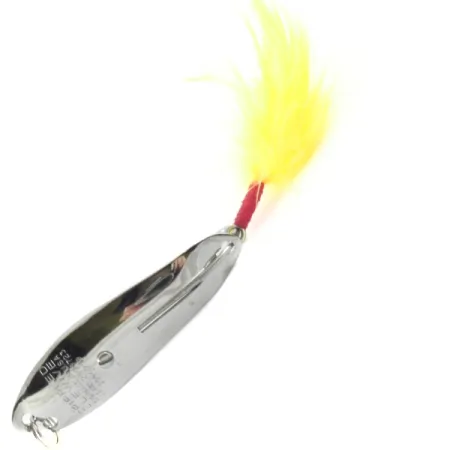 Poliruota nikelio apdaila atspindi šviesą ant šios 6,5 cm (2 1/2") blisgės, išryškindama jos išskirtinę nežolėjančią konstrukciją. 12,5 g (2/5 oz) svorio Crippled Alewive masalas pasižymi neįprasta sandara su specialiu tvirtinimo varžtu vidinėje blisgės dalyje. Vienšakis kablys yra apsaugotas vieline apsauga nuo žolių ir papuoštas ryškiai geltonu plunksniniu vilioku, pritvirtintu tvirta raudonų siūlų apvija prie kilpelės. Įgaubtoje metalo pusėje aiškiai matomas išmuštas „CRIPPLED ALEWIVE“ pavadinimas bei kilmės šalis USA, žyminti vidurio amžiaus Amerikos gamybą. Šis konkretus egzempliorius, identifikuojamas produkto kodu 4138, yra 5/5 būklės, o jo paviršius išlaikęs itin švarią dangą. Atspindinčio korpuso ir plunksninio priedo derinys sukurtas žvejams, gaudantiems plėšrūnus tankioje augmenijoje.