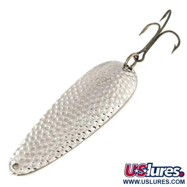 Tekstūruota, kalto nikelio apdaila dengia iškilųjį šios 9 cm (3 1/2") vartiklės paviršių, sukurtą sklaidyti šviesą keliomis kryptimis po vandeniu. Ši 28 g (1 oz) sverianti Eppinger Dardevle, žymima produkto kodu 11122, pasižymi puikiomis metimo savybėmis gaudant lydekas ar didelius upėtakius įvairiomis sąlygomis. Kita pusė išlieka lygi ir poliruota, su autentišku „DARDEVLE DETROIT USA“ antspaudu, žyminčiu gamybos istoriją Mičigane. Furnitūrą sudaro bronzinis trišakis kabliukas, pritvirtintas tvirtu žiedeliu; kabliuko gėla gerai išsilaikiusi, matomos minimalios naudojimo žymės. Atsižvelgiant į ryškų antspaudą ir nikeliavimo vientisumą, masalo būklė vertinama 5/5. Eppinger šias patentuotas formas JAV naudoja nuo XX a. pradžios, užtikrindama specifinį svorio paskirstymą, kuriuo žvejai pasitiki mėtydami ir velkiaudami dešimtmečius.