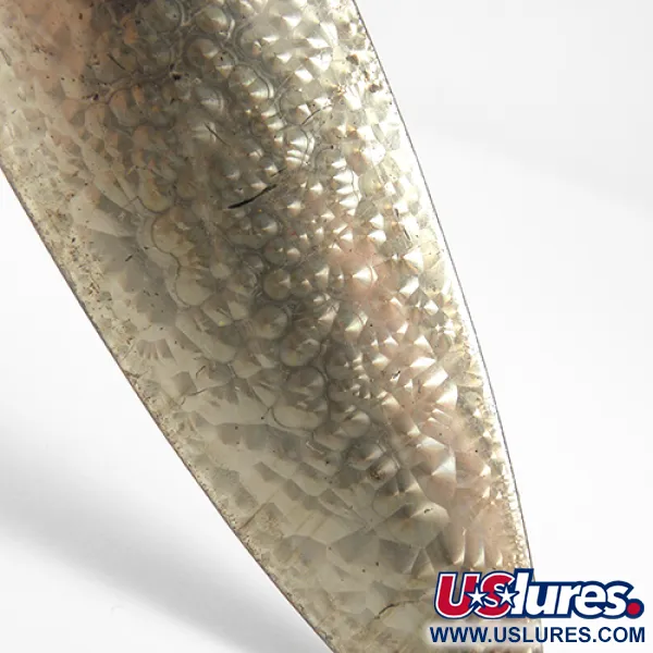 Švytintis kalamo sidabro paviršius apibūdina šį 1 uncijos (28 g) egzempliorių, pasižymintį klasikinė „Crystal“ sidabrinių žvynų tekstūra. 3 1/2 colio (9 cm) ilgio Eppinger Dardevle (produkto kodas 1605) turi giliai įspaustą paveldą savo įgaubtoje apatinėje pusėje, aiškiai pažymėtą Detroito (JAV) kilme. Metalinis paviršius išlieka ryškus, atspindėdamas šviesą per tekstūruotus briaunotus paviršius, skirtus išskirtiniam svyruojančiam žaismui tolygiai traukiant. Kalbant apie furnitūrą, žiedelis tvirtai laiko tvirtą trišakį kabliuką. Būklė vertinama 4/5, matomos tik nedidelės paviršiaus žymės, kurios negadina blizgaus paviršiaus. Šis egzempliorius pasižymi būdingu pailgu lašo formos profiliu, dėl kurio prekės ženklas tapo pagrindiniu įrankiu nuo Lou Eppinger ankstyvųjų laikų. Masalo nugarėlė padengta poliruotu nikelio tonu, pabrėžiant įskaitomus gamintojo ženklus ir ikonišką prekės ženklą, įspaustą metale.