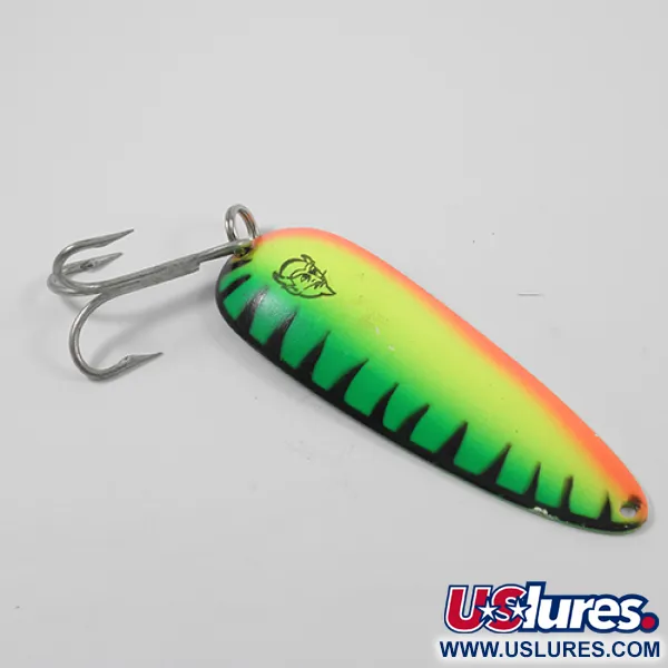 Sverdama 1oz (28g), ši klasikinė Eppinger blizgė pasižymi ikonišku Fire Tiger raštu ant savo 3 1/2" (9cm) korpuso. Paviršius yra ryškus neoninės geltonos ir žalios spalvos gradientas, apvestas ryškia oranžine linija ir papildytas juodais vertikaliais dryžiais vienoje pusėje. Ant žalvarinės nugarėlės aiškiai matomi autentiški „DARDEVLE“ ir „EPPINGER DETROIT“ įspaudai kartu su svorio žyma. Šis konkretus egzempliorius turi prekės kodą 2697, o dažytoje pusėje puikuojasi klasikinis velnio galvos logotipas. Furnitūrą sudaro tvirtas, sidabrinio atspalvio trišakis kabliukas, pritvirtintas patikimu žiedeliu. Šis masalas yra 5/5 būklės, atspindintis kruopščią priežiūrą, kurios tikimasi iš gerai išlaikyto kolekcinio egzemplioriaus. Žalvarinė konstrukcija suteikia natūralų blyksnį, kuris papildo ryškias viršutinės dalies spalvas žvejojant įvairiomis apšvietimo sąlygomis.