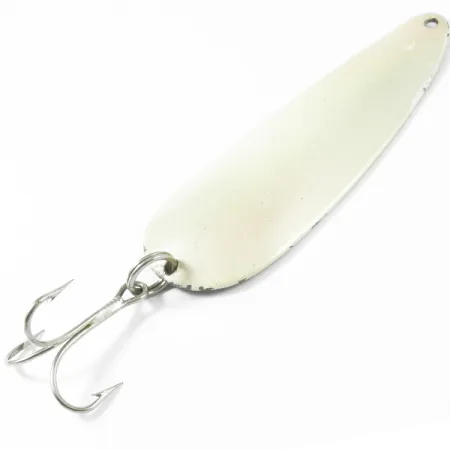 Dramblio kaulo spalvos dažai dengia išgaubtą šios 28 g (1 oz) blizgės paviršių, todėl tai puikus pasirinkimas žvejybai skaidriame vandenyje. Apvertus masalą išryškėja poliruoto nikelio apdaila su aiškiai įspaustu „DARDEVLE DETROIT U.S.A.“ ženklu. Ši 9 cm (3 1/2") ilgio Eppinger klasika, žymima prekės kodu 3344, pasižymi svoriu, reikalingu tolimiems metimams. Dramblio kaulo apdaila turi nedidelių naudojimo žymių ir minimalų kraštų nusidėvėjimą, todėl jos būklė vertinama solidžiais 4 balais iš 5. Kiekviena detalė – nuo įgaubto pailgo korpuso iki tvirto žiedelio aštriam trišakiui kabliui – liudija apie unikalias gamybos formas, kurias Eppinger šeima naudoja nuo pat prekės ženklo ištakų Mičigane. Nikelio spalvos nugarėlė sukuria ryškų atspindį matiniame dramblio kaulo spalvos priekyje – tai spalvų derinys, išliekantis pagrindiniu pasirinkimu žvejojant plėšrias žuvis.
