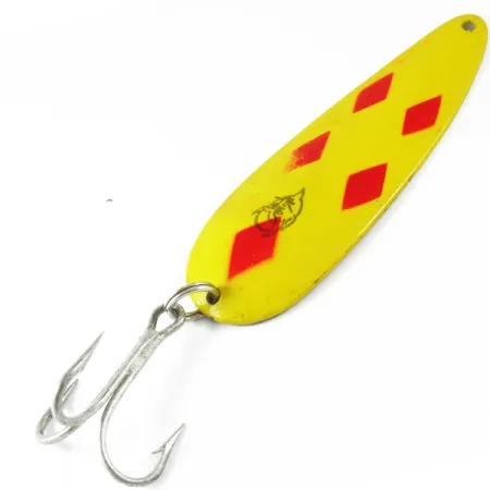 Geltoni dažai, papuošti penkiais išskirtiniais raudonais rombais, identifikuoja šį raštą – pagrindinį įrankį lydekų ir maskinongų žvejams. Ši 9 cm (3 1/2") ilgio ir 28 g (1 oz) svorio Eppinger Dardevle blizgė, turinti produkto kodą 3497, įkūnija Detroite gimusios inovacijos sielą. Kitoje pusėje rasite spaudą, nurodantį kilmę iš Detroito, JAV – tai detalė, kuri priskiria dizainą ankstesniam įmonės gamybos laikotarpiui. Įgaubtas metalinis korpusas sukurtas taip, kad tolygiai traukiant sukurtų svyruojantį darbą. Apdaila puikiai išlaikyta, paviršius švarus, matomi tik minimalūs naudojimo požymiai, o tai atitinka 4/5 būklę. Prie blizgės per žiedelį pritvirtintas tvirtas sidabrinis trišakis kabliukas, o klasikinį velnio galvos logotipą galima pamatyti priekinėje dalyje prie pilvelio. Šis egzempliorius pabrėžia patentuotas formas, kurias Eppinger naudoja daugiau nei šimtmetį, kad išlaikytų specifinę masalo geometriją ir svorio paskirstymą.