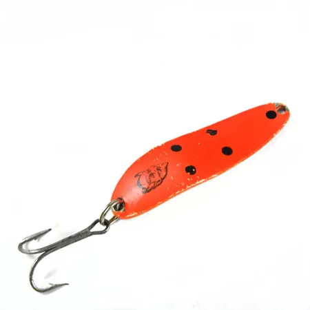 Oranžinė spalva su juodais taškeliais ir klasikinė velnio galvos emblema paverčia šią 10 g (1/3 oz) blizgę išskirtiniu bet kurios vintažinės kolekcijos eksponatu. 5,5 cm (2 1/4") ilgio Cop-E-Cat pasižymi įgaubtu metaliniu korpusu, kurio nugarėlėje įspaustas užrašas 'Detroit USA', nurodantis gamybą ankstyvaisiais Eppinger veiklos metais iki 1959-ųjų persikėlimo į Dearborną. Šis konkretus pavyzdys, identifikuojamas prekės kodu 0393, turi nedidelių nusidėvėjimo žymių (atitinka 4/5 būklės įvertinimą), kurios daugiausia matomos kaip maži dažų nutrupėjimai palei kraštą. Svoris ir forma yra pritaikyti metimui ir tolygiam traukimui, sukuriančiam svyruojantį judesį į šonus. Tvirtas trišakis kabliukas yra saugiai pritvirtintas, o ryški apdaila išlieka spindinti. Detroit įspaudas aiškiai matomas sidabrinės spalvos kitoje pusėje, tiesiai virš žiedelio.