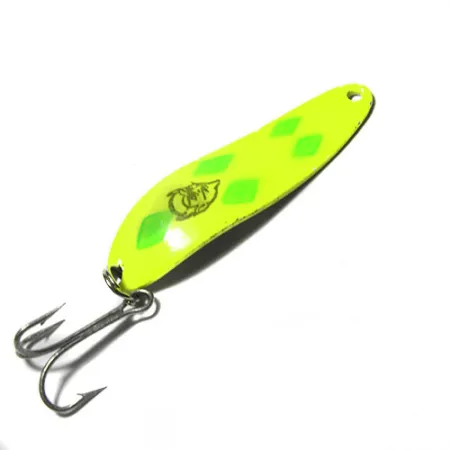 Galinėje blisgės pusėje, poliruoto sidabro fone, aiškiai išmuštas modelio žymėjimas „COP-E-CAT 7300 U.S.A.“. Šis 10 g (1/3 oz) svorio pavyzdys, atpažįstamas pagal produkto kodą 0416, pasižymi ryškia fluorescencine geltona priekine dalimi, dekoruota keturiais žaliais rombais. 5,5 cm (2 1/4 colio) ilgio metalinis korpusas išlaiko klasikinį įgaubtą profilį – tai techninė „Eppinger“ kompanijos, gaminančios šiuos masalus Mičigane nuo XX a. pradžios, konstrukcijos ypatybė. Priekinėje dalyje yra atpažįstamas juodas velnio galvos logotipas, būdingas „Dardevle“ linijai. Įrangą sudaro funkcionalus žiedelis ir tvarkingas trišakis kablys. Masalas turi labai nedidelių dėvėjimosi žymių po buvimo žvejybos dėžutėje, jo būklė vertinama 4/5. Poliruota sidabrinė nugarėlė sukuria didelio kontrasto blyksnį ryškiai geltonos ir žalios spalvos paviršiaus fone.