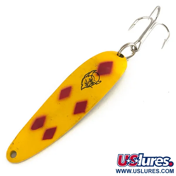 Žalvario atspalvio nugarėlėje aiškiai iškalta „COP-E-CAT 7400 DETROIT U.S.A.“, siejanti šią 14 g blizgę su jos Mičigano paveldu. Ši konkreti Eppinger Dardevle Cop-E-Cat 7400, kurios prekės kodas yra 9166, pasižymi klasikine „Five of Diamonds“ apdaila – ryškiai geltonas paviršius su penkiais raudonais rombais. Priekinėje dalyje taip pat yra atpažįstamas juodas velnio galvos logotipas, simbolizuojantis Lou Eppinger įmonės įkūrimą Detroite 1906 m. Blizgė yra 6,5 cm ilgio, pailgo, įgaubto korpuso, skirta spiningavimui ir velkiavimui. Šis egzempliorius yra puikios būklės, vertinamas 5/5, su švariais dažais priekinėje dalyje ir blizgančia, gerai išsilaikiusia metaline nugarėle. Ji išlieka su originaliu žiedeliu ir trišakiu kabliuku, atspindinčiu XX a. vidurio Amerikoje pagamintų žūklės įrankių kokybę.
