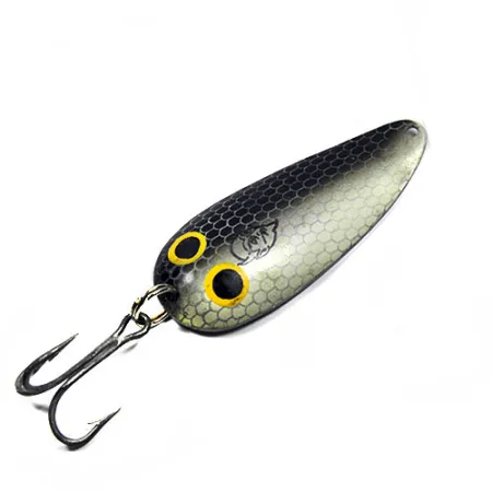 21 g (3/4 oz) svoris suteikia šiai blizgei reikiamą masę tolimiems metimams ir kontroliuojamam traukimui. Produkto kodu 0338 žymima ši Eppinger Dardevle Dardevlet yra 7 cm (2 3/4") ilgio ir pasižymi detalia „Black Natural“ apdaila. Paviršius padengtas smulkiu šešiakampiu tinkliniu žvynų raštu, kuris pereina iš tamsios anglies spalvos nugarėlės į matinį pilkai sidabrinį korpusą. Šalia kilpelės valui tvirtinti dvi ryškios, geltonai nudažytos akys su juodais vyzdžiais juosia įspaustą velnio galvos logotipą – Lou Eppinger Detroite 1906 m. įkurtos įmonės prekės ženklą. Šis JAV pagamintas masalas remiasi savo specifine įgaubta geometrija, kuri sukuria firminį svyruojantį judesį vandenyje. Furnitūra, įskaitant žiedelį ir trišakį kablį, neturi jokių nusidėvėjimo žymių, todėl būklė vertinama puikiai – 5/5.