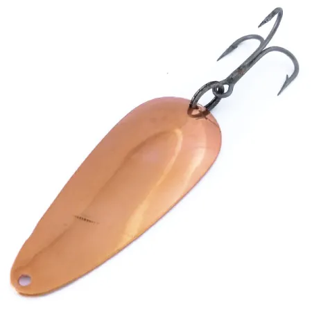 Giliai įspaustas „DARDEVLET DETROIT U.S.A.“ ženklas ant įgaubtos nugarėlės atspindi Lou Eppinger gamybos palikimą dar prieš įmonės persikėlimą 1959 m. Ši varinė vartomoji blizgė, sverianti 21 g (3/4 oz) ir esanti 7 cm (2 3/4") ilgio, pasižymi tankiu, reikalingu tolimiems metimams ar kontroliuojamam velkiavimui. Produkto kodas 10747 identifikuoja šį konkretų variantą, pasižymintį vientisa vario apdaila tiek ant išgaubto, tiek ant įgaubto paviršiaus. Tamsios apdailos trišakis kablys pritvirtintas tvirtu žiedeliu platesniame lašo formos korpuso gale. Būklė vertinama 4/5, paviršius švarus, išryškinantis originalų metalo apdirbimą. Tiksliai išgręžta skylė siaurajame gale skirta valui tvirtinti, išlaikant balansą, nustatytą pagal originalias Eppinger formas.