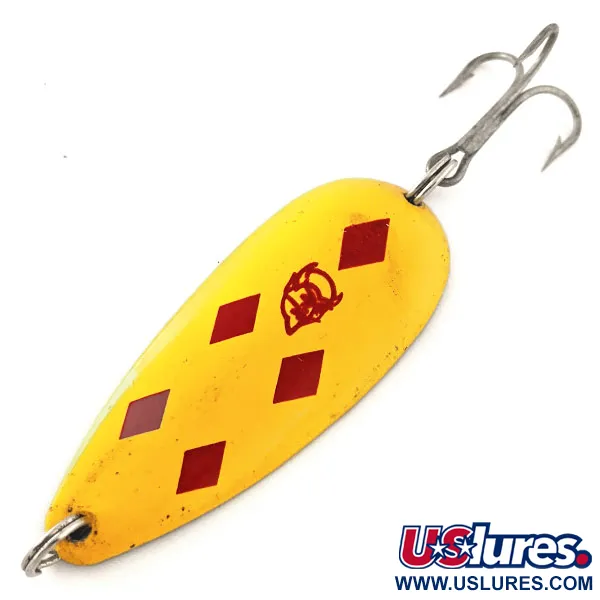 Ši 21 g (3/4 oz) svorio Eppinger blizgė pasižymi ikonišku Five of Diamonds raštu – penkiais sodriai raudonais rombais ryškiai geltoname fone. Šis Dardevle Dardevlet modelis, kurio ilgis yra 7 cm (2 3/4"), išlieka pagrindiniu pasirinkimu Mičigane pagamintos žūklės įrangos entuziastams. Priekinę dalį puošia klasikinė raudona velnio galvos emblema, o ant nugarėlės esantis žalvarinis štampas patvirtina, kad masalas pagamintas Dearborne, Mičigano valstijoje. Šis konkretus egzempliorius, kurio prekės kodas 11970, yra 5/5 būklės, su puikia apdaila ir išsaugotais dažais, pabrėžiančiais Lou Eppinger dizaino paveldą. Blizgės forma ir įgaubtas paviršius išgaunami naudojant gamintojo patentuotas formas, užtikrinant tradicinei spiningavimo technikai reikalingą darbą. Masalas sukomplektuotas su originalia furnitūra: aštriu trišakiu kabliuku ir tvirtais žiedeliais, pritvirtintais per tiksliai išgręžtas kilpes.