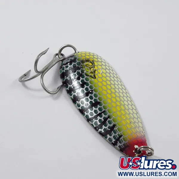 Šios 3/4 oz (21 g) blizgės įgaubtoje pusėje esanti žalvarinė apdaila turi įspaustus „Dardevlet“ ir „Eppinger“ ženklus. Šis 2 3/4 colių (7 cm) egzempliorius, pažymėtas prekės kodu 2691, pasižymi Perch spalviniu raštu su geltonai žalia korio tekstūros žvynelių danga virš vertikalių juodų juostų ir raudonais akcentais galuose. 1959 m. „Eppinger“ perkėlė gamybą iš Detroito į Dirborną, Mičigano valstijoje, ir toliau naudoja patentuotas formas šiai specifinei pailgai formai, kuri apibūdina prekės ženklą daugiau nei šimtmetį, gauti. Įrangą sudaro klasikinė trišakis kablys, pritvirtintas žiedeliu. Kalbant apie būklę, ji vertinama 4/5, pasižymi švariu paviršiumi su minimaliais naudojimo ženklais per daugelį metų. Dirbant su šiuo masalu, lėtas traukimas leidžia sunkiam žalvariniam korpusui efektyviai blizgėti. Šio dizaino patikimumas yra legendinis – karo metu jis netgi buvo įtrauktas į aviacijos išgyvenimo rinkinius dėl savo įrodyto gebėjimo duoti rezultatų. Tekstūruotos žvynelių apdailos ir šiltos žalvarinės apatinės dalies derinys daro jį pagrindiniu pasirinkimu žvejams, gaudantiems plėšrias žuvis įvairaus skaidrumo vandenyse.