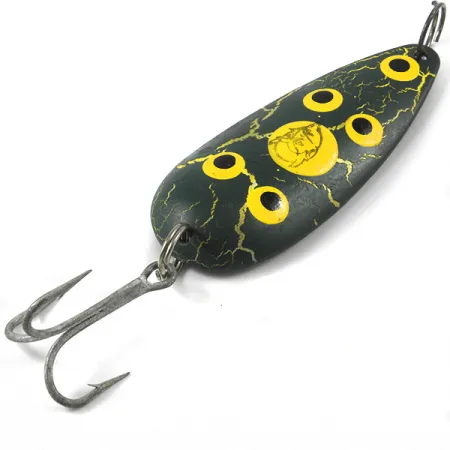 3/4 oz (21 g) svoris suteikia šiai blizgei pakankamai masės, kad ji galėtų skrosti priešpriešinį vėją tolimų metimų metu. Klasikine Frog apdaila padengtas paviršius turi tamsų pagrindą su geltonu „crackle“ efektu ir penkiomis ryškiomis geltonomis dėmėmis su juodais centrais. Ikoniškas velnio galvos logotipas geltonai šviečia ties 2 3/4" (7 cm) korpuso viduriu. Kitoje masalo pusėje – poliruotas nikelis su giliu gamintojo įspaudu „DARDEVLET EPINGER DETROIT USA“, liudijančiu Eppinger įmonės šaknis Mičigane nuo 1906 metų. Šis konkretus egzempliorius (kodas 3284) yra puikios 5/5 būklės, dažai ir furnitūra atrodo nepriekaištingai. Komplektacijoje yra tvirtas trišakis kablys, pritvirtintas žiedeliu, tinkamas velkiavimui ar mėtymui. Kontrastas tarp tamsaus, tekstūrinio viršaus ir blizgaus nikelio nugarėlės sukuria stiprų vizualinį blyksnį judant vandenyje.