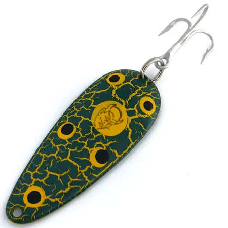 Ši 21 g (3/4oz) svorio senovinė blizgė yra puikus pasirinkimas norint pasiekti gilesnius vandenis arba išlaikyti kontrolę tolimo metimo metu. Ši Eppinger Dardevle Dardevlet, pažymėta produkto kodu 9750, pasižymi klasikine „Frog“ apdaila – įspūdingu tamsiai žalio skeldėjimo rašto deriniu ant geltono pagrindo. Penki ryškūs geltoni taškai su juodais viduriais yra išdėstyti per visą korpusą, centre įrėmindami ikonišką velnio galvos logotipą. 7 cm (2 3/4 colio) ilgio korpusas išlaiko patentuotą įgaubtą formą, kurią „Eppinger“ bendrovė ištobulino savo Mičigano gamykloje nuo 1959 metų. Kita pusė yra poliruoto nikelio, su giliai įspaustu gamintojo ženklu ir kilmės vieta Dearborn, JAV. Blizgė turi originalų sidabrinio atspalvio trišakį kabliuką ir sustiprintą žiedelį. Šis egzempliorius yra nenaudotas, 6/5 būklės, išlaikęs gamyklinį blizgesį tiek ant dažyto paviršiaus, tiek ant metalinės nugarėlės. Gamyboje naudojamos klišės yra specifinės šiam prekės ženklui, užtikrinančios, kad fiziniai matmenys atitiktų standartus, kuriuos Lou Eppinger nustatė prieš daugiau nei šimtmetį.