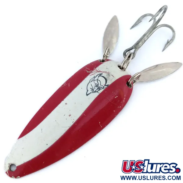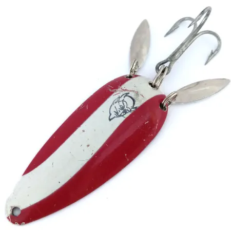7 cm (2 3/4") ilgio pailgas šios blizgės korpusas pasižymi legendiniu kontrastingų raudonų ir baltų juostų raštu. Šis 21 g (3/4 oz) svorio metimo įrankis, žymimas prekės kodu 11062, turi išskirtinį juodą velnio galvos logotipą, įspaustą tiesiai ant centrinės baltos juostos. Eppinger Dardevle Dardevlet Klicker unikalumą suteikia dvi lašo formos nikelio garso plokštelės, pritvirtintos prie galinio žiedo. Šios plokštelės sukonstruotos taip, kad traukiant masalą kaukšėtų į blizgę ir viena į kitą, suteikdamos mechaninį garso elementą vizualiam blyksniui. Kitoje masalo pusėje yra poliruoto nikelio apdaila, kurioje įspaustas gamintojo ženklas. Bendras egzemplioriaus stovis geras, matomi tik lengvi paviršiaus įbrėžimai ir nedideli dažų nuskilimai, atitinkantys 4/5 būklės įvertinimą. Furnitūra išlieka tvirta, sumontuotas standartinis sidabrinio atspalvio trišakis kablys, paruoštas vandeniui ar kolekcijai. Mičigane sukurti Lou Eppinger dizainai dešimtmečius išliko beveik nepakitę, pasikliaujant šia specifine įgaubta geometrija, skirta gaudyti šviesą.