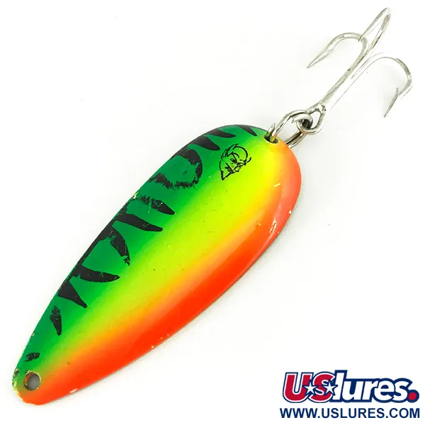 Ši 21 g (3/4 oz) svorio štampuota metalinė blizgė pasižymi sodria Fire Tiger apdaila, skirta maksimaliam matomumui. Šis konkretus Dardevlet UV modelis (produkto kodas 7211) yra 7 cm (2 3/4") ilgio ir turi štampuotą velnio galvos logotipą prie viršutinio žiedelio. Pagaminta JAV, Eppinger gamykloje; blizgės konstrukcija išlaiko firminę įgaubtą formą, kuri garsina prekės ženklą nuo Lou Eppinger laikų Detroite. Fluorescenciniai dažai reaguoja į UV šviesą – tai moderni klasikinės blizgės evoliucija, leidžianti jai išsiskirti giliame ar drumstame vandenyje. Furnitūrą sudaro tvirtas žiedelis ir aštrus trišakis kablys, o būklė vertinama 5/5. Kolekcininkai įvertins ryškų perėjimą tarp žalios, geltonos ir oranžinės spalvų bei ryškius juodus tigro juostų kontūrus. Kita blizgės pusė yra lygi, atitinkanti Dearborn gamyklos kokybės standartus.