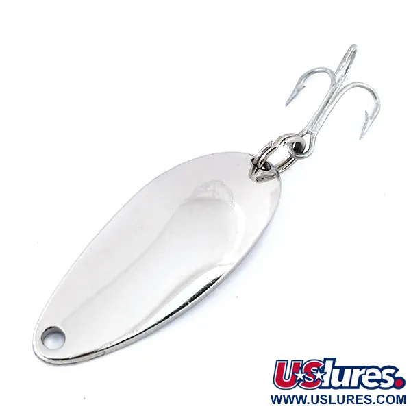 Aukštai nušlifuotas nikelio paviršius apibūdina šios klasikinės blizgės estetiką, užtikrinant puikų matomumą skaidriame vandenyje. Šis Eppinger Dardevle Devle Dog 5200, pažymėtas prekės kodu 10682, sveria 1/4 uncijos (7g) ir yra 1 1/2 colio (4cm) ilgio. Apvertus masalą matomas gilus antspaudas „DEVLE-DOG 5200 DETROIT U.S.A.“, žymintis jo kilmę ir Lou Eppingerio Mičigano meistriškumo palikimą, prasidėjusį 1906 m. Pailgas, įgaubtas korpusas sukurtas taip, kad gaudytų šviesą, suderintas su sidabro spalvos trišakiu kabliuku. Įvertintas 5/5 būkle, egzempliorius išlaikė ryškų, veidrodinį paviršių ir aštrias kabliukų viršūnes. Šioje serijoje naudojamos patentuotos Eppinger formos, užtikrinančios, kad tradicinė forma išliktų tokia pati kaip masalų, naudojamų išgyvenimo rinkiniuose ir žvejybos dėžėse ištisoms kartoms. Sidabrinis trišakis kabliukas pritvirtintas prie blizgės galo tvirtu žiedeliu.