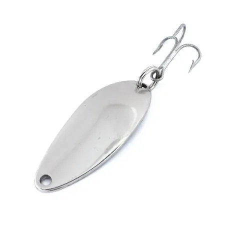 Šis 7 g (1/4 oz) svorio masalas yra klasikinis Amerikos žūklės įrankių istorijos pavyzdys. Kitoje pusėje aiškiai išspaustas „DETROIT - U.S.A.“ ženklas atspindi Lou Eppingerio įmonės ankstyvąjį paveldą iki jų persikėlimo į Dearborną 1959 m. Poliruota nikelio apdaila ant šios 4 cm (1 1/2") blizgės išlieka pastebimai ryški ir atspindinti šviesą – toks pasirinkimas dažnai vertinamas viliojant žuvis skaidriame vandenyje. Šis specifinis modelis, Dardevle Devle Dog 5200, pasižymi išskirtine pailga forma su giliu įgaubtu paviršiumi. Tvirtas trišakis kablys prie plataus galo pritvirtintas tvirtu metaliniu žiedeliu, o siaurame gale yra švari anga valui rišti. Produktas, pažymėtas kodu 10877, pasižymi puikiai išlaikytu ir švariu metaliniu paviršiumi, o tai pagrindžia 5/5 būklės įvertinimą. Įspaudas taip pat apima pavadinimą „DEVLE-DOG 5200“, kuris išlieka ryškus ir įskaitomas ant metalinės nugarėlės.
