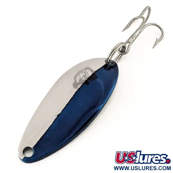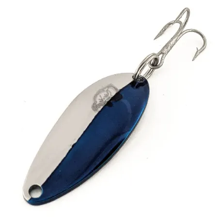Ryški Nickel / Blue spalvų gama puošia šios vintažinės Dardevle Devle Dog 5200 blisgės paviršių, atspindėdama šviesą būtent taip, kaip sumanė Lou Eppinger. 1 1/2 colio (4 cm) ilgio blisgė pasižymi ikonišku įgaubtu pailgu korpusu, dėl kurio šis prekės ženklas tapo žinomas nuo pat jo įkūrimo Detroite 1906 m. Šis konkretus masalas, produkto kodas 12652, sveria 1/4 uncijos (7 g), o jo kitoje pusėje įspaustas Dearborn, MI adresas, rodantis, kad jis pagamintas po įmonės persikėlimo 1959 m. Galinė pusė išlieka švari ir blizgi, joje aiškiai matomas modelio pavadinimas ir vieta, o furnitūrą sudaro tvirtas žiedelis ir originalus sidabrinis trišakis kabliukas. Šis egzempliorius nenaudotas, atrodo šviežiai ir puikiai išsilaikęs, tarsi ką tik nuimtas nuo pakuotės kortelės. Skirta spiningavimui ar velčiavimui, o storas metalas užtikrina, kad masalas išlaikytų gylį net ir lėtai traukiant.