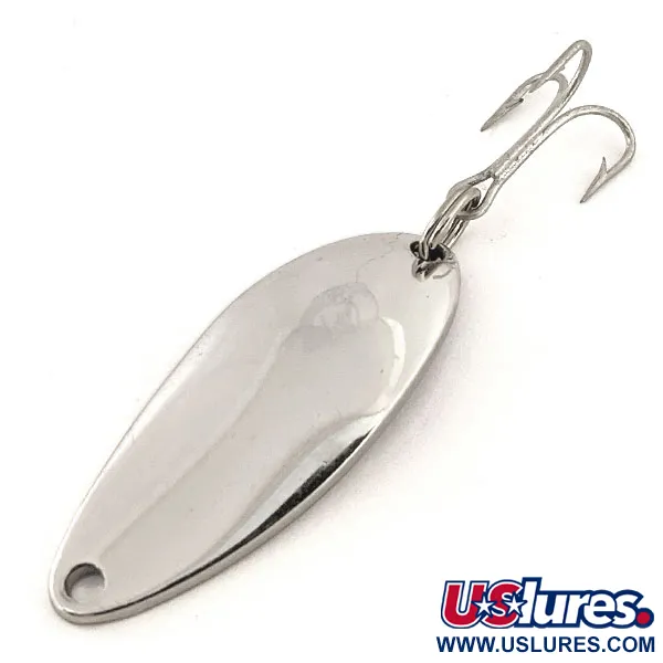 Ant įgaubtos pusės aiškiai pažymėta „DEVLE-DOG 5200 DETROIT USA“ – ši nikeliuota vartiklė reprezentuoja klasikinį „Eppinger“ gamybos istorijos etapą. 4 cm (1 1/2") ilgio ir 7 g (1/4 oz) svorio masalas pasižymi kompaktišku profiliu, tinkamu spiningavimui ar velkiavimui. Poliruota Nickel apdaila parinkta dėl ryškaus blyksėjimo, todėl tai patikimas pasirinkimas skaidriame vandenyje, kur masalas imituoja natūralią smulkių žuvelių išvaizdą. Šis egzempliorius (produkto kodas 12822) su trišakiu kabliuku ir žiedeliu atspindi „Eppinger“ nuo 1906 m. Detroite puoselėjamą tvirtą konstrukciją. Būklė vertinama 5/5, nes metaliniai paviršiai yra švarūs, be žymių nusidėvėjimo požymių. Antspaudas rodo, kad masalas pagamintas dar prieš įmonės persikėlimą į Dirborną 1959 m., pabrėžiant istorinį ryšį su ankstyvąja prekės ženklo sėkme.