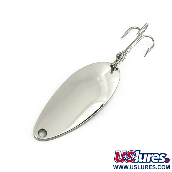 Poliruotame metale aiškiai įspausta žyma „DETROIT U.S.A.“ identifikuoja šią Dardevle Devle Dog 5200 kaip apčiuopiamą Eppinger istorijos dalį. Kataloge nurodoma kodu 7422, ši blizgė yra 4 cm (1 1/2") ilgio ir sveria 7 g (1/4 oz), todėl yra universalus pasirinkimas spiningavimui lengvais įrankiais arba velkiavimui. Aukšto blizgesio nikelio apdaila išlieka ryški ir veidrodinė, atspindinti nenaudotą jos būklę. Šis konkretus modelis pasižymi klasikinė pailga šaukšto forma su giliu įgaubtu profiliu – tai firminis Eppinger dizainas, sukurtas siekiant sukurti ryškų svyruojantį judesį traukiant masalą. Galinėje dalyje sumontuotas tvirtas trišakis kablys, pritvirtintas žiedeliu, o priekinė dalis turi paprastą, švariai išgręžtą skylę valui rišti. Detroit žyma ant tokio švaraus egzemplioriaus suteikia tiesioginį ryšį su prekės ženklo šaknimis Mičigane prieš įmonei persikeliant į Dearborną 1959 m. Kiekviena šios 7 g (1/4 oz) blizgės detalė – nuo tikslaus žymėjimo iki tolygaus padengimo – demonstruoja amerikietišką kokybę, dėl kurios šie masalai išlieka žvejų dėžutėse ištisas kartas.