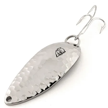 Kaltas nikelis suteikia spindinčią, šviesą atspindinčią tekstūrą šios vartiklės priekinėje dalyje – tai apdaila, skirta dideliam matomumui. Ši 3/5oz (16g) sverianti Eppinger Dardevle Devle Dog 5400 identifikuojama pagal prekės kodą 13067. Ikoniškas velnio galvos logotipas aiškiai įspaustas tekstūruotos pusės centre, o lygioje kitoje pusėje yra gilios graviruotės su modelio pavadinimu ir gamybos vieta Dearborn, Michigan. Šis egzempliorius yra 5/5 būklės, pasižymi šviesiu, švariu paviršiumi ir originalia furnitūra, įskaitant tvirtą trišakį kabliuką, pritvirtintą per žiedelį. „Eppinger“ naudoja šias patentuotas formas savo gamykloje Mičigane nuo tada, kai 1959 m. persikėlė iš Detroito, išlaikydami tvirtą konstrukciją, kuria kolekcininkai ir žvejai pasitiki daugiau nei šimtmetį. Kilpelė valui tvirtinti priekyje yra atvira ir taisyklingos formos tiek metimui, tiek velkiavimui.