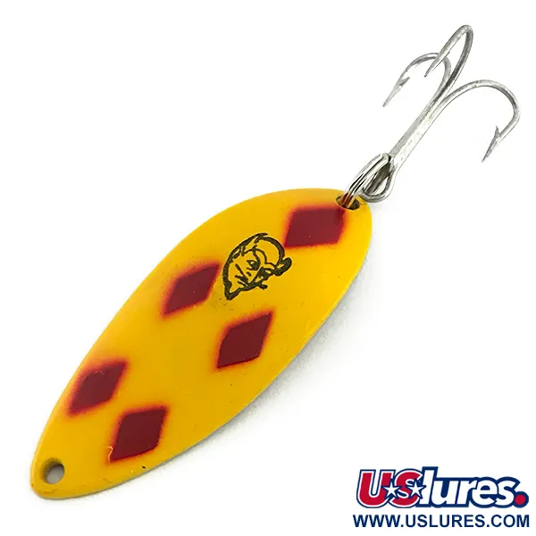Ant poliruotos žalvarinės šio egzemplioriaus nugarėlės išspausti žodžiai „DEVLE DOG 5400“ ir „DETROIT U.S.A.“ – tai aiški nuoroda į Mičigano valstijoje esančias „Eppinger Manufacturing“ šaknis. Ši 5,5 cm (2 1/4") ilgio ir 14 g (1/2 oz) svorio blizgė pasižymi ikonišku „Five of Diamonds“ raštu: penki ryškūs raudoni rombai tiksliai išdėstyti ryškiai geltoname fone. Klasikinis juodas velnio galvos logotipas ryškiai atspaustas ant priekinės dalies – tai 1906 m. Lou Eppingerio įkurto prekės ženklo skiriamasis ženklas. Šis vintažinis gaminys, kurio prekės kodas 8724, yra nenaudotas, išlaikęs originalų blizgesį ir ryškų dažymą. Konstrukciją sudaro tvirtas sidabrinio atspalvio trišakis kablys, pritvirtintas žiedeliu gale, ir paruošta anga valui galvutėje. Įgaubta, pailga forma išgaunama naudojant patentuotas liejimo formas JAV gamybos procese, specialiai pritaikytas mėtymui ar velčiavimui.
