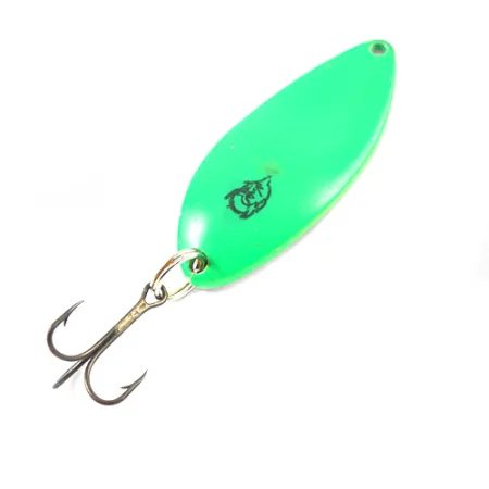 Ryškiai žali dažai dengia išgaubtą šios klasikinės vartiklės pusę, kurią puošia ikoniškas juodas velnio galvos logotipas. Ši 21 g (3/4 oz) svorio ir 6,5 cm (2 1/2") ilgio Dardevle Devle Dog 7800 (Kodas 1803) yra neatsiejama Eppinger asortimento dalis. Kitoje pusėje yra poliruoto nikelio apdaila su aiškiai matomu įspaudu „DEVLE-DOG 7800 DETROIT U.S.A.“, primenančiu istorinius įmonės gamybos pradžios metus Detroite prieš persikėlimą 1959 m. Šis konkretus egzempliorius yra 4/5 būklės, su gerai išlikusiomis detalėmis ir švaria apdaila. Konstrukciją sudaro tvirtas žiedelis ir aštrus bronzuotas trišakis kabliukas. Nors Eppinger garsėja tradicinėmis raudonai baltomis juostomis, ši vientisai žalia variacija siūlo išskirtinį vizualinį profilį specifinėms vandens sąlygoms. Pailga forma ir įgaubtas pilvelis yra tiksliai suformuoti naudojant patentuotas formas – tai technika, kurią Lou Eppinger ištobulino siekdamas užtikrinti stabilią kiekvieno masalo kokybę nuo 1906 m. Ši vartiklė skirta spiningavimui, o jos svoris leidžia pasiekti didelį metimo nuotolį, o išlenktas profilis sukuria jai būdingą žaismingą judėjimą į šonus.