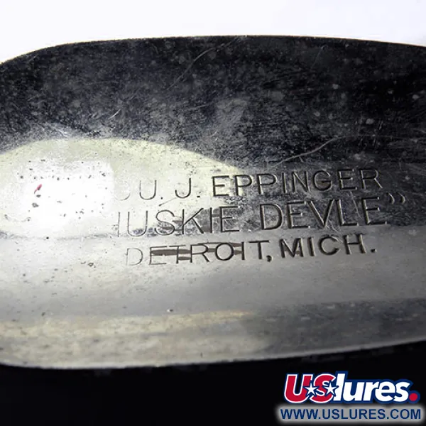 Ši 3 1/4 oz (91 g) sverianti masyvi blinkė yra skirta spiningavimui giliuose vandenyse arba velkiavimui medžiojant trofėjinius plėšrūnus. Šis Eppinger egzempliorius, žinomas kaip Huskie Devle (produkto kodas 0245), yra įspūdingo 5 1/2" (14 cm) ilgio. Klasikinė raudona / balta spalva priekinėje dalyje papildyta išskirtine korio rašto tekstūra ant baltų segmentų. Apvertus masalą, atsiveria štampuota chromuota nugarėlė su aiškiu užrašu „EPPINGER HUSKIE DEVLE“ ir kilmės vietos nuoroda „DEARBORN, MICH.“, kuri leidžia datuoti šį modelį laikotarpiu po įmonės persikėlimo 1959 metais. Unikali šio modelio savybė – mažas, geltonai dažytas papildomas lapelis, pritvirtintas prie galinio žiedo, dekoruotas raudonais rombais ir ikonišku velnio galvos logotipu. Furnitūra itin tvirta: didelis, sidabrinės apdailos trišakis kablys yra paruoštas rimtoms apkrovoms. Esant 4/5 būklės, dažai išlieka ryškūs, o metalas išlaiko aukštos kokybės blizgesį, demonstruodamas patvarų to meto amerikiečių meistriškumą. Štampuotos detalės nugarėlėje išlieka ryškios ir lengvai įskaitomos poliruotame paviršiuje.
