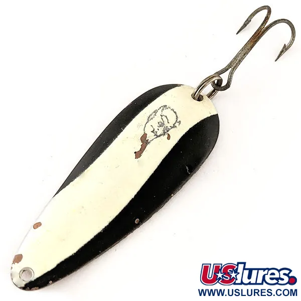 Ant varinio nugarėlės paviršiaus išspaustas „DARDEVLE IMP U.S.A.“ logotipas pažymi šią 5,5 cm (2 1/4") blinkę kaip tikrą Mičigano žvejybos istorijos dalį. 11 g (2/5 oz) svorio metalinis korpusas pasižymi ryškiu vertikalių juodų ir baltų juostų raštu – universaliu spalvų deriniu, skirtu įvairiam vandens skaidrumui. Šis konkretus egzempliorius, pažymėtas prekės kodu 12451, yra 4/5 būklės: matomi nedideli dažų nusitrynimai kraštuose ir priekinėje dalyje, apnuoginantys vario pagrindą, tačiau negadinantys centrinio velnio galvos grafinio elemento. Eppinger būdingas įgaubtas dizainas suteikia blinkei jai būdingą vartymosi judesį tolygiai traukiant – tai techninis dizaino bruožas, išlikęs nepakitęs nuo tada, kai Lou Eppinger pradėjo juos gaminti rankomis savo rūsyje. Įranga išlieka tvirta: naudojamas klasikinis trišakis kablys, pritvirtintas tvirtu žiedeliu, tinkamas tiek spiningavimui, tiek velkiavimui.