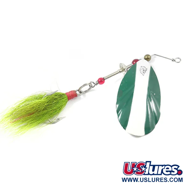 Ryškus šviesiai žalios (chartreuse) spalvos elnio kailio (bucktail) uodegėlė sukuria ryškų profilį šios 12 cm (4 3/4") vintažinės sukrės gale. 15 g (1/2 oz) svorio Eppinger Dardevle JT Buel modelis pasižymi nikliuota lapelio nugarėle ir klasikiniu žaliai bei baltai dryžuotu priekiu. Eppinger velnio galvos logotipas yra balto dryžio centre, o kitoje pusėje matomas aiškus "2/0 J.T. BUEL" įspaudas. Konstrukciją sudaro centrinė vielos ašis su dviem raudonais karoliukais ir poliruotu metaliniu tarpikliu, užtikrinančiu tinkamą lapelio sukimąsi. Produktas pažymėtas kodu 2238 ir yra puikios 5/5 būklės – dažai bei detalės išlaikę originalų blizgesį. Trišakis kablys saugiai integruotas į bucktail puošmeną, kuri tvirtai apvyniota raudonu siūlu, derančiu prie karoliukų. Lašo formos lapelis suprojektuotas suktis aplink pasunkintą ašį tolygiai traukiant masalą.