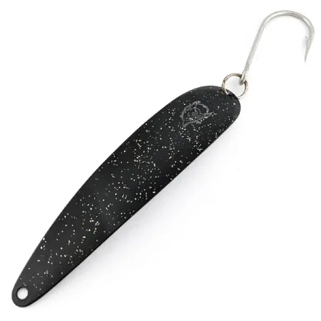 Padengtas sidabriniais blizgučiais ant gilaus juodo pagrindo, šis modelis sukuria didelio kontrasto profilį vandens paviršiuje. 9 g svorio ir 10 cm ilgio „Dardevle King Flutter Devle“ yra rafinuotas Detroite pagamintas „Eppinger“ žūklės įrankių istorijos fragmentas. Ant vartiklės priekio pavaizduotas kultinis velnio galvos logotipas, o kitoje pusėje įspausta „KING FLUTTER DEVLE“ ir „DETROIT U.S.A.“, patvirtinantys amerikietišką kilmę. Atpažįstamas pagal prekės kodą 22995, šis masalas yra puikios būklės, įvertintas 5/5. Jame sumontuotas didelis sidabrinis vienšakis kablys su tvirtu žiedeliu – tokia konstrukcija mėgstama siekiant sumažinti kliuvinių skaičių velkiaujant. Šiam modeliui naudojamas plonesnis metalas nei standartinėms mėtymo vartiklėms, todėl tai yra specializuotas įrankis velkiavimui įvairiuose gyliuose. Valo tvirtinimo anga yra lygi ir kokybiška, užtikrinanti patikimą mazgo laikymą visą žvejybos dieną.